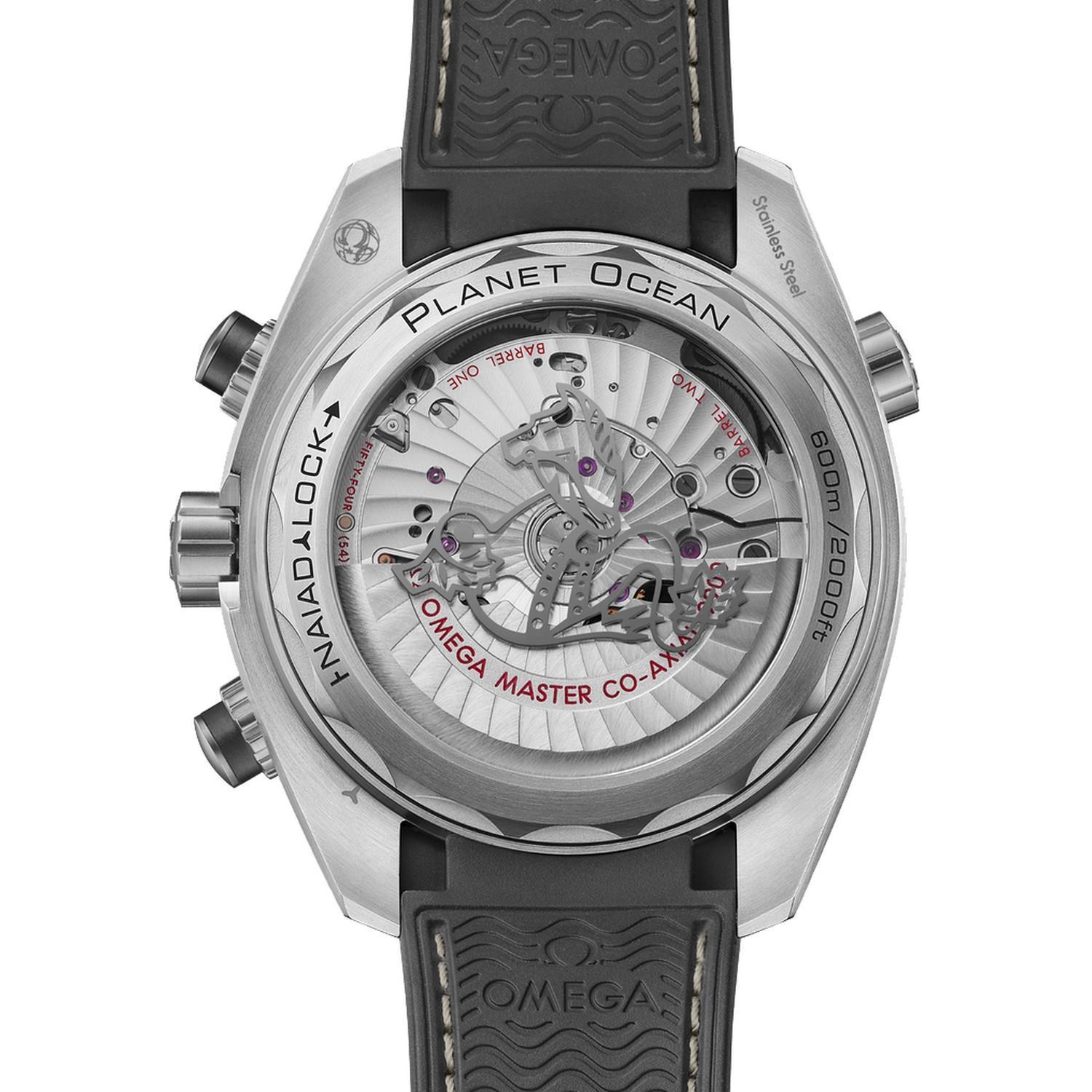 Diese Seamaster Planet Ocean, die vom Co-Axial Master Chronometer Kaliber 9900 angetrieben wird, ist mit einem integrierten dunkelgrauen Kautschukarmband mit strukturiertem Muster und beigefarbener und dunkelgrauer Naht ausgestattet. Den NAIAD LOCK Gehäuseboden ziert ein metallisiertes Seepferdchen auf dem Saphirglas.