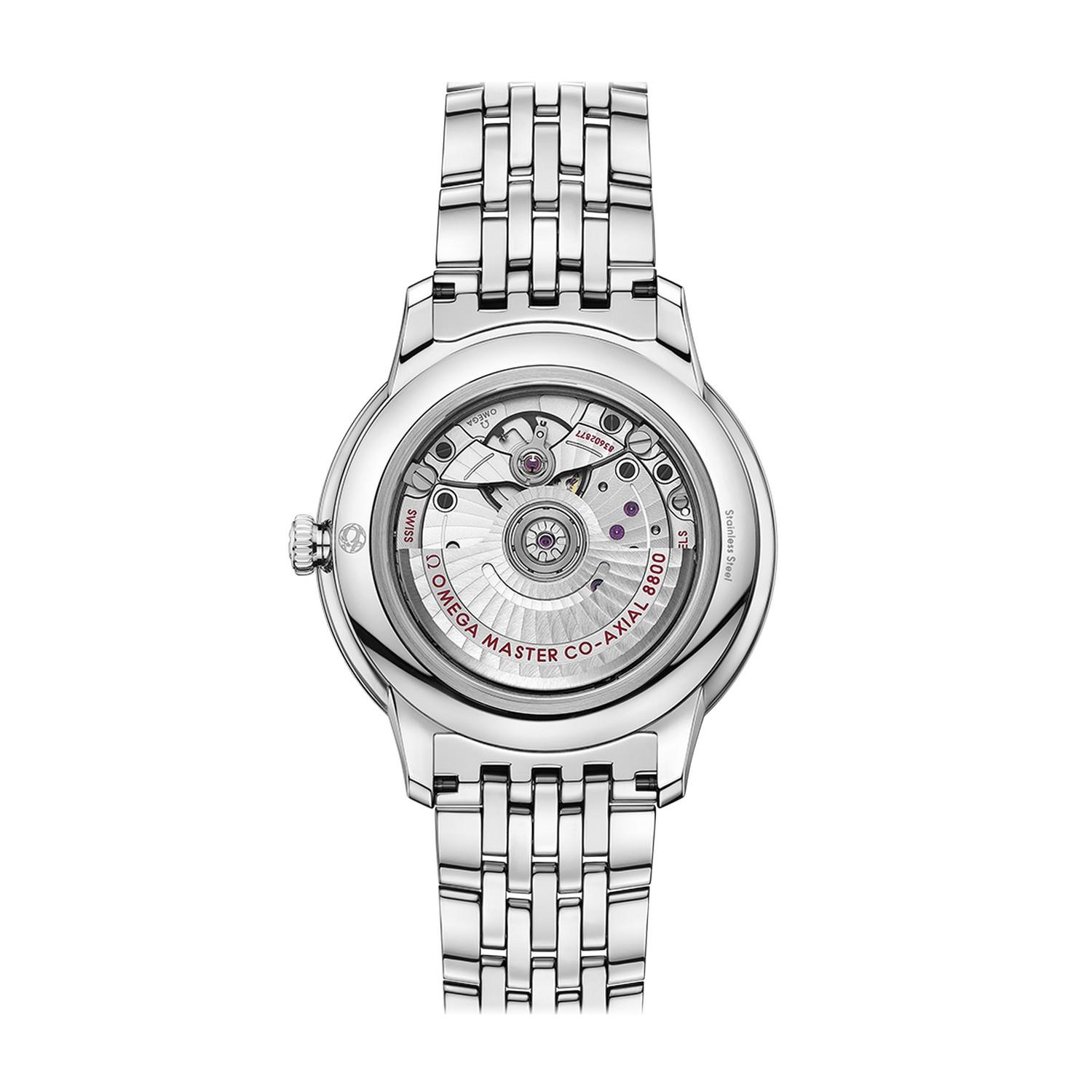 Diese Master Chronometer-zertifizierte Uhr wird mit einem Edelstahlarmband präsentiert und vom OMEGA Master Co-Axial Kaliber 8800 angetrieben, das durch den kratzfesten Saphirglasboden bewundert werden kann.
