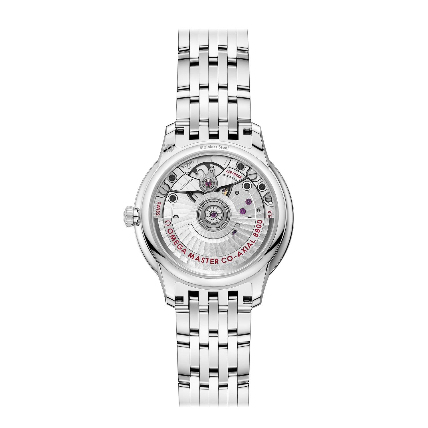 Diese als Master Chronometer zertifizierte Uhr wird von einem Armband aus Edelstahl am Handgelenk gehalten und von dem OMEGA Master Co-Axial Kaliber 8800 angetrieben, das durch den kratzfesten Saphirglasboden bewundert werden kann.
