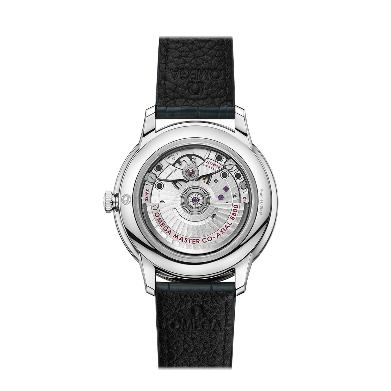 Diese als Master Chronometer zertifizierte Uhr wird von einem kieferngrünen Lederarmband am Handgelenk gehalten und von dem OMEGA Master Co-Axial Kaliber 8800 angetrieben, das durch den kratzfesten Saphirglasboden bewundert werden kann.