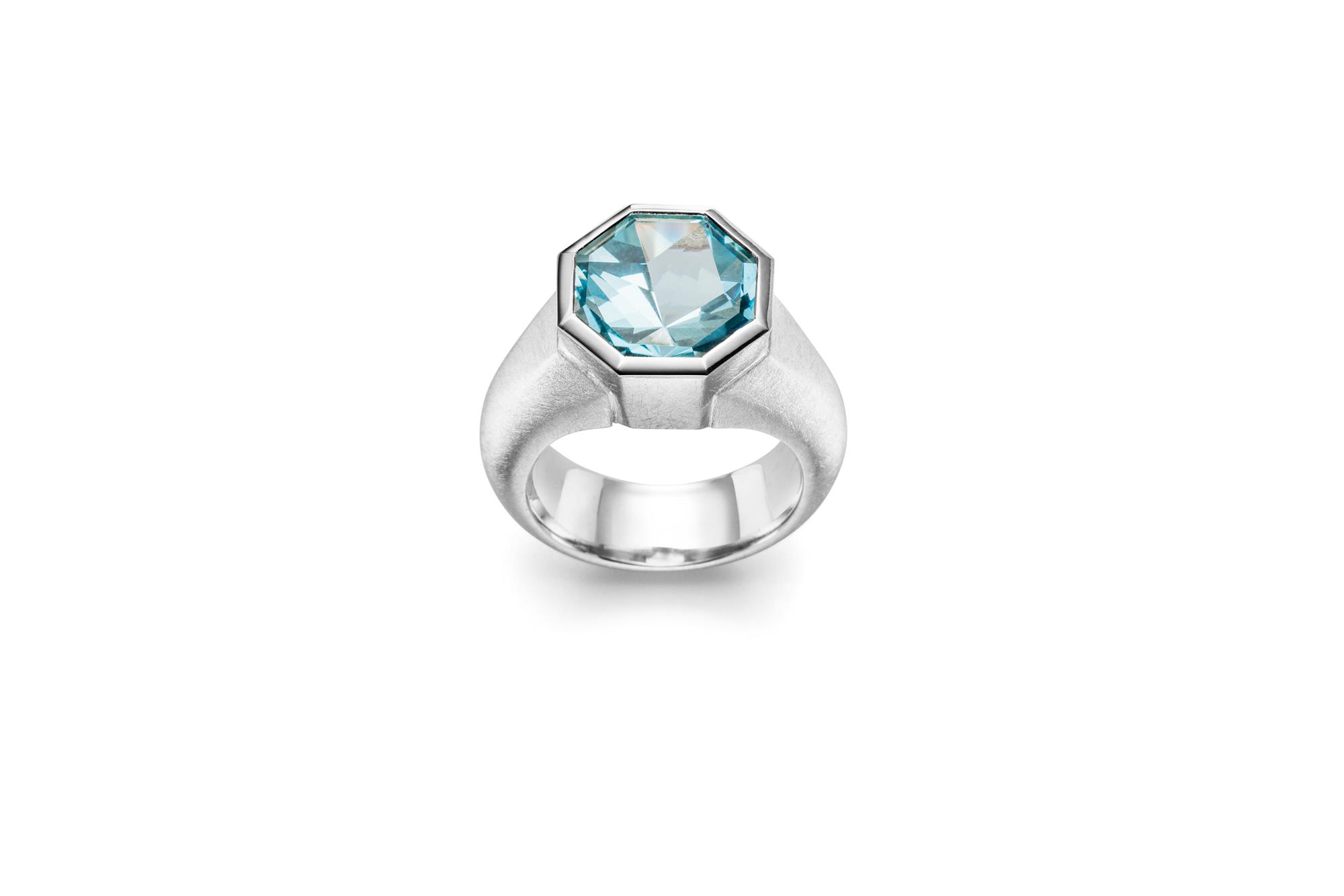 DARIN EINGEFASST IST EIN HELLBLAUER TOPAS IM AUSSERGEWÖHNLICHEN ACHTECKIGEN SCHIFF.