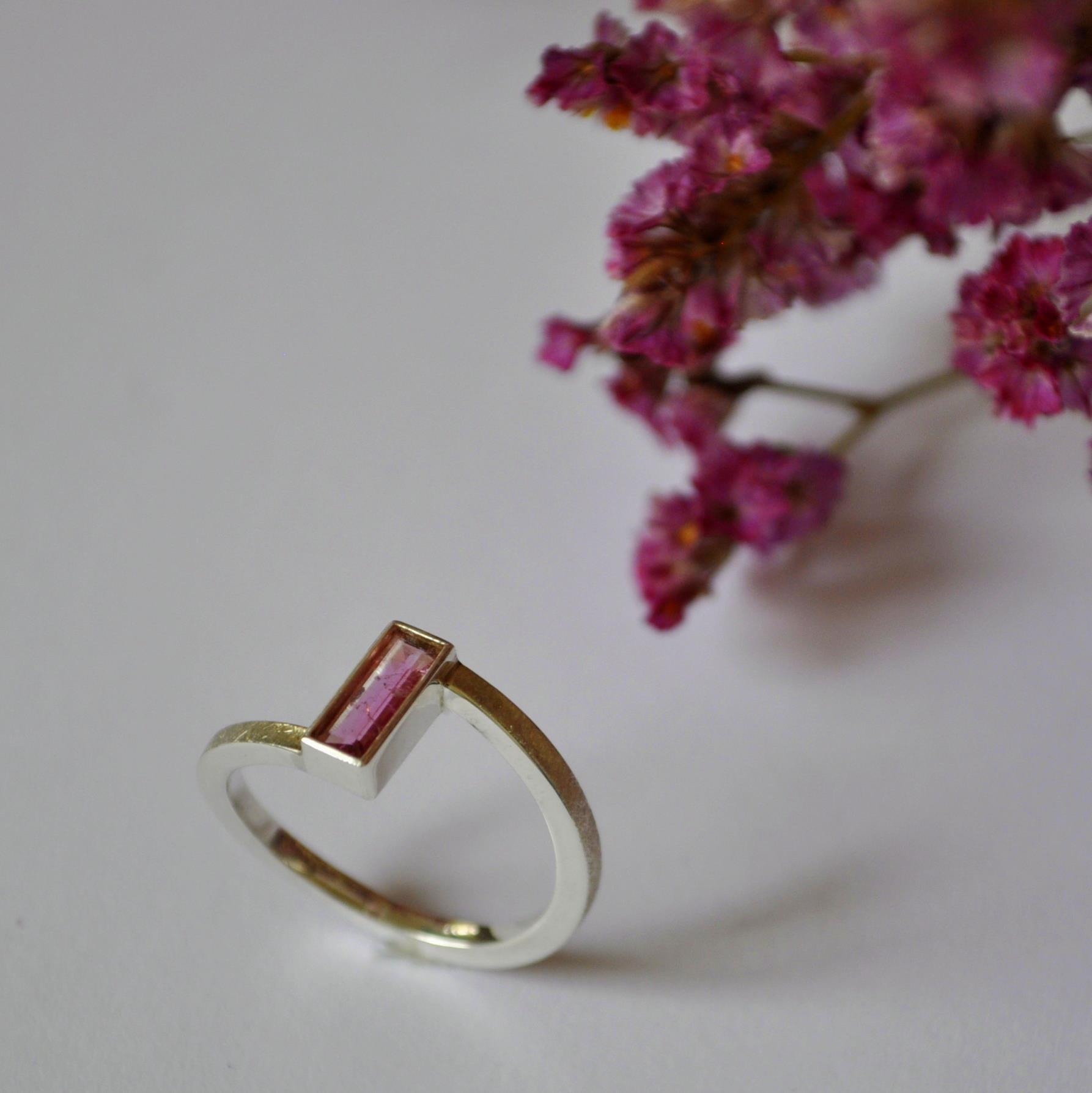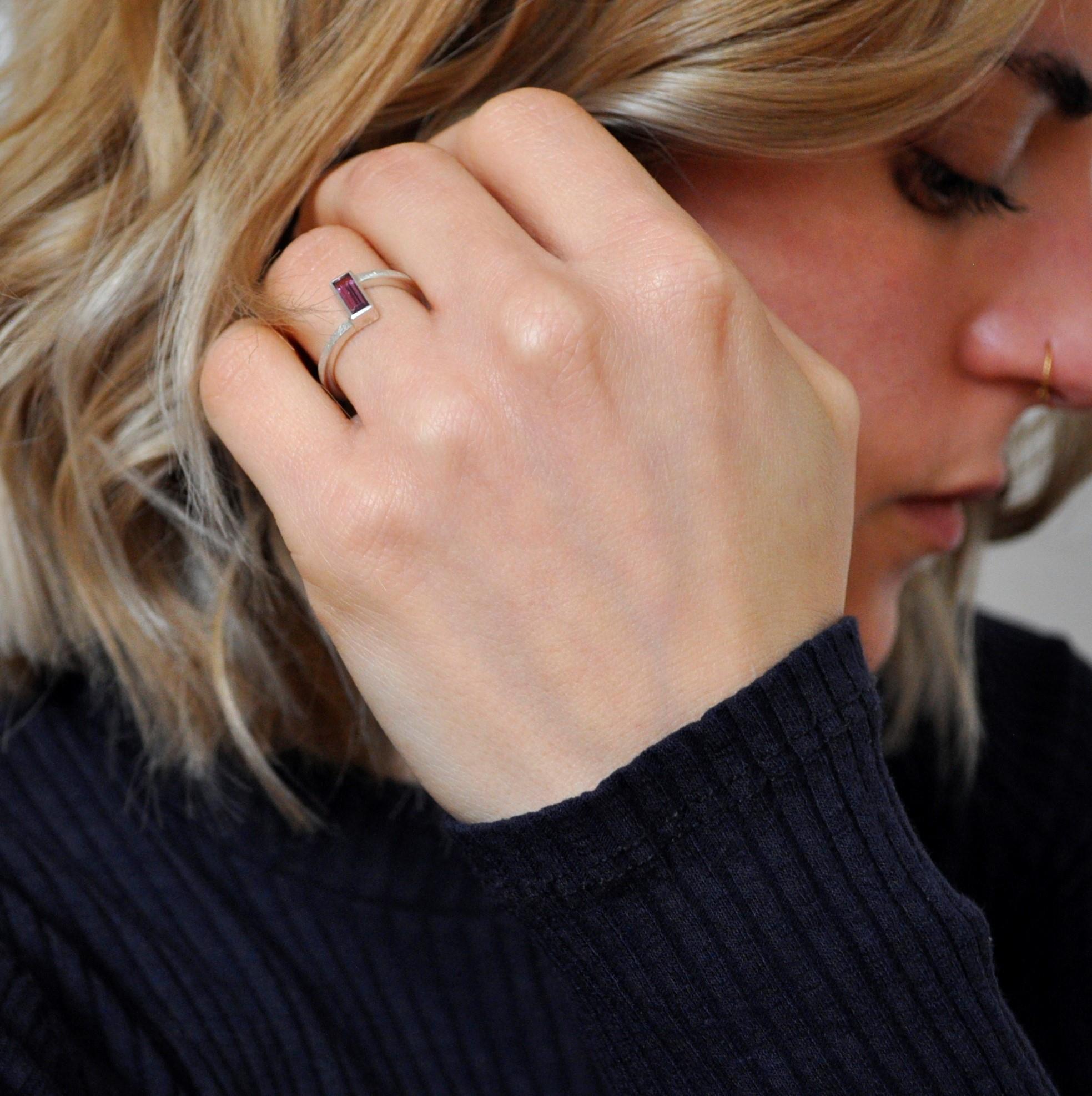 Der Ring “Verwinkelt” windet sich nicht einfach nur um den Finger. Er nimmt einen Umweg in Kauf und wird dabei von besonderen Edelsteinen begleitet. So wird er zu einem ausdrucksvollen, farbenfrohen Ring, ohne seine Leichtigkeit zu verlieren.