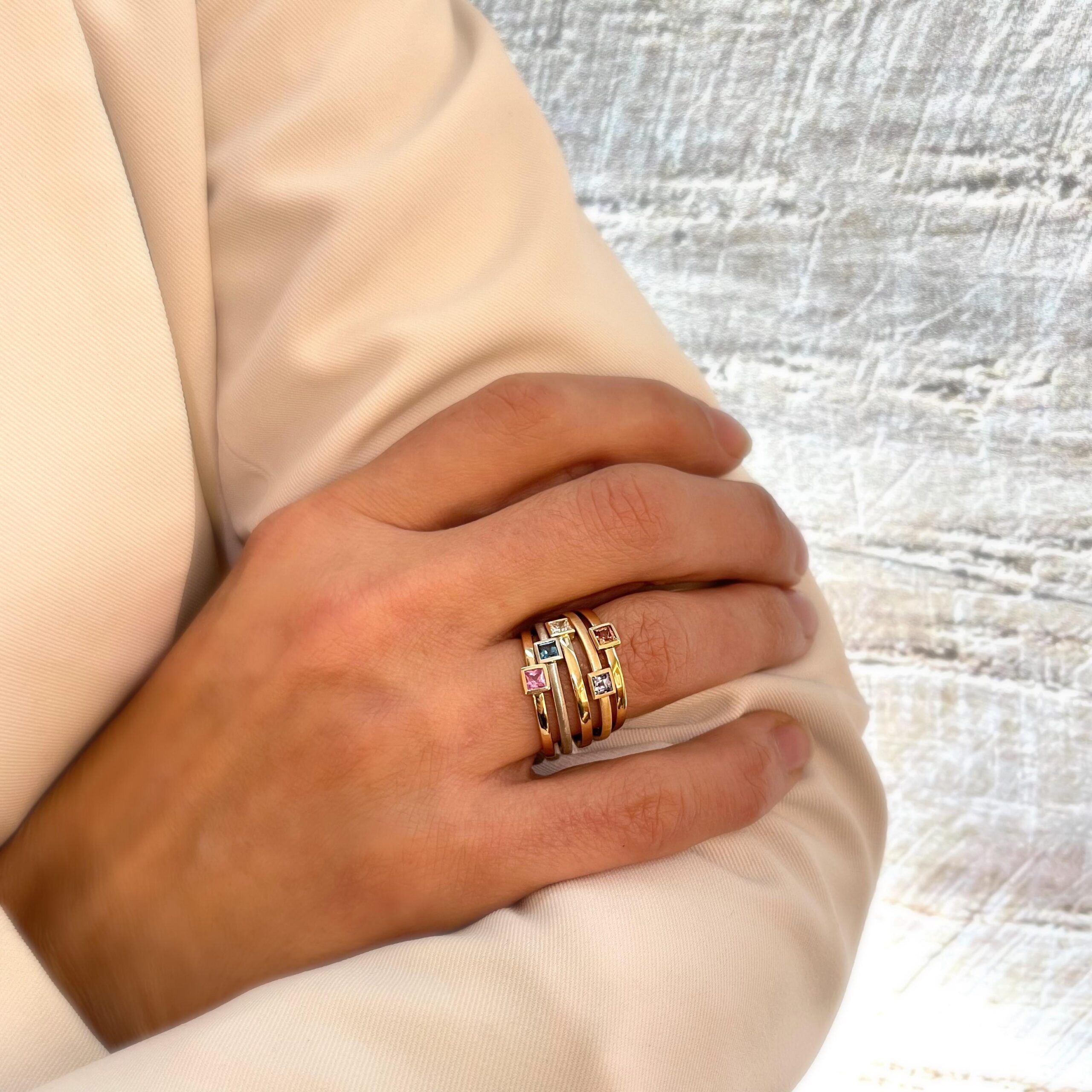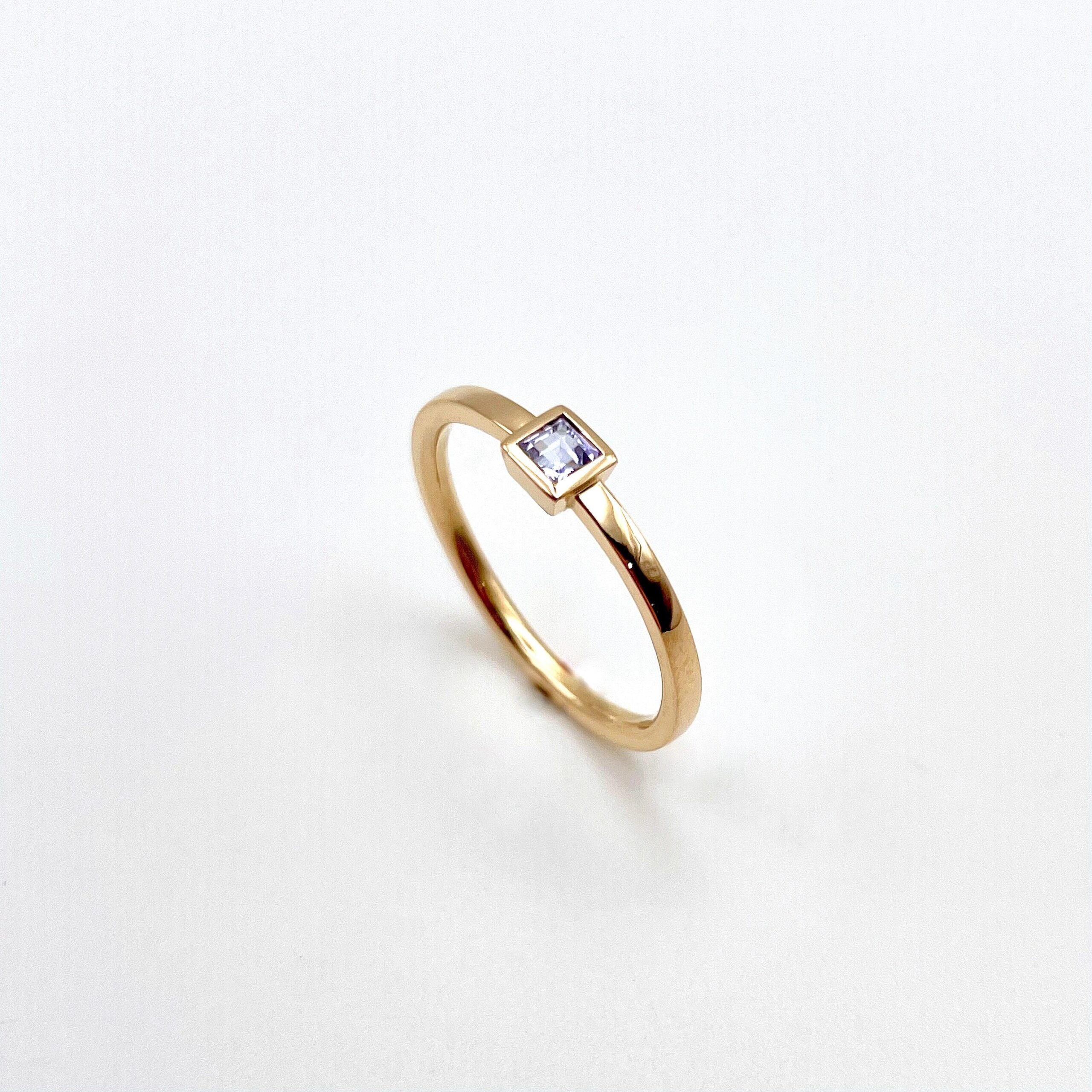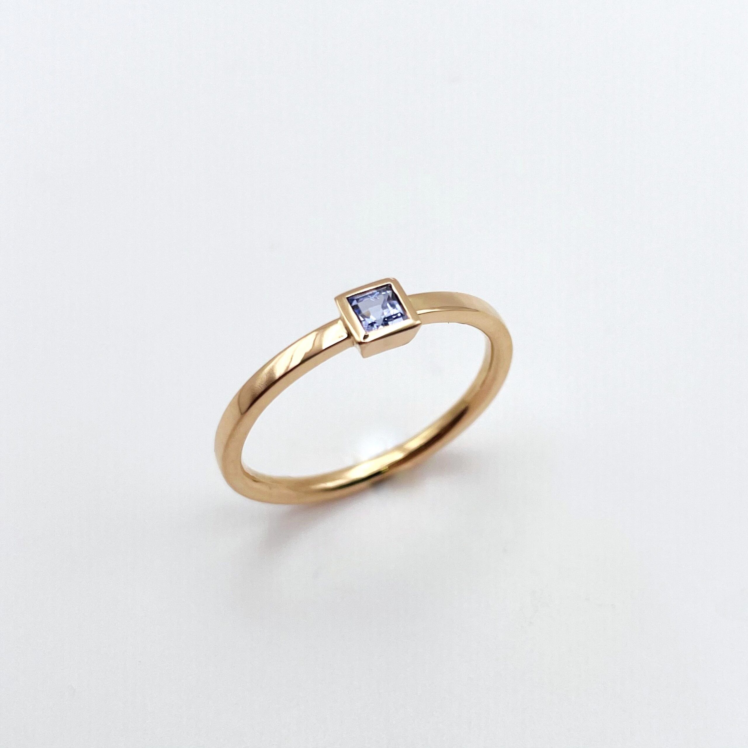 EINE SCHMALE RINGSCHIENE AUS ROSÈGOLD TRIFFT AUF EINEN ZARTEN TANSANIT IM CARRÈSCHLIFF.