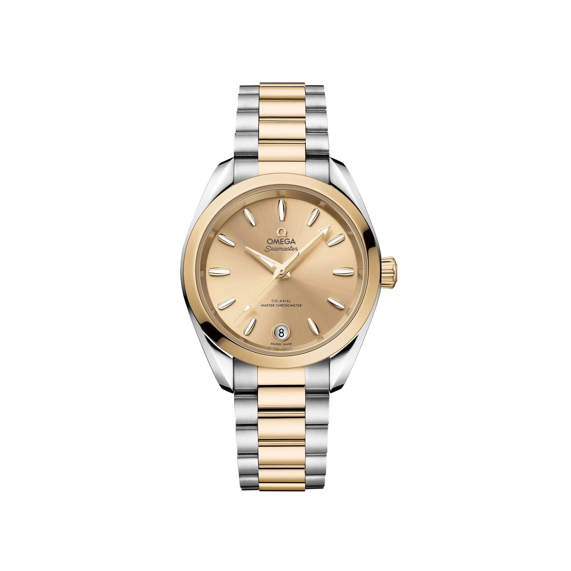 Dieses 34-mm-Modell aus poliertem Edelstahl und 18 K Moonshine™-Gold besitzt eine konische Krone sowie einen Gehäuseboden mit Wellenmuster und einem flachen Saphirglas. Das lackierte Zifferblatt mit Sonnenschliff und PVD-Beschichtung aus Moonshine™-Gold ist mit einem runden Datumsfenster bei 6 Uhr versehen, das von einem Ring aus Moonshine™-Gold umrahmt wird. Auch für die facettierten Zeiger und die charakteristischen Stundenindizes, die wie Bootsrümpfe geformt und mit weißer Super-LumiNova gefüllt sind, hat OMEGA 18 K Moonshine™-Gold verwendet.