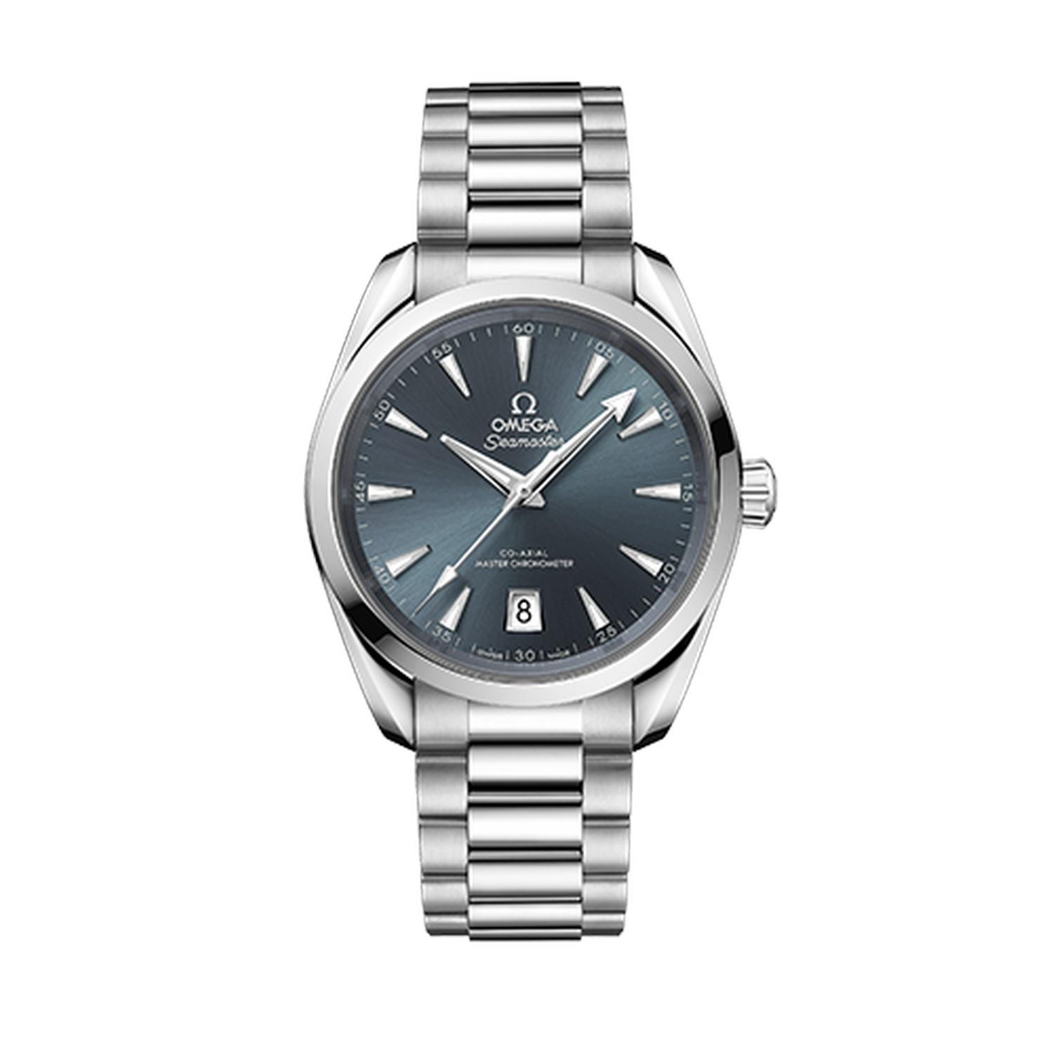 Die Seamaster Aqua Terra ist eine Hommage an OMEGAs großes maritimes Erbe. Dieses 38-mm-Modell verfügt über ein symmetrisches Gehäuse und eine Krone aus vollständig poliertem Edelstahl und ein Wellendekor auf dem Gehäuseboden.