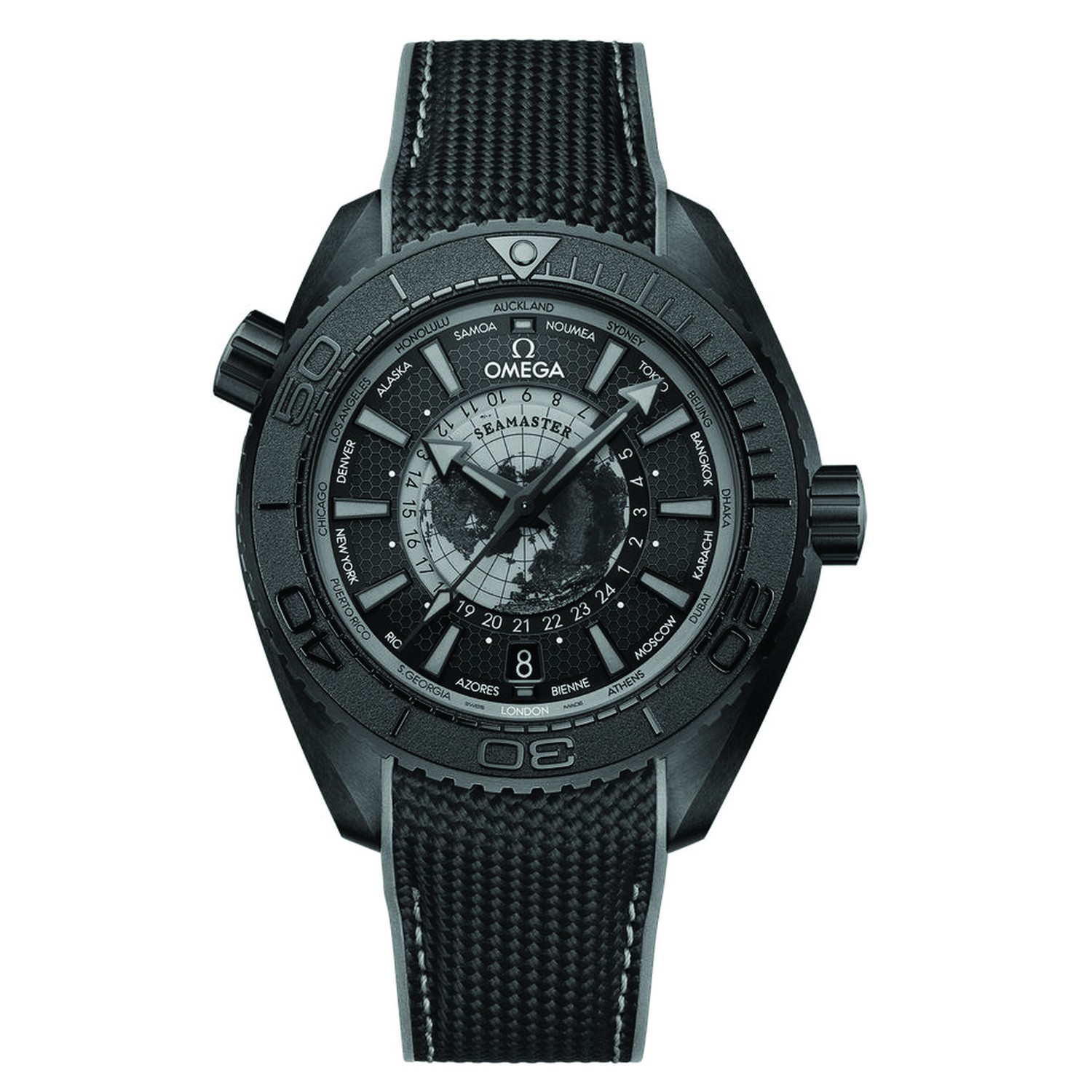 Der äußere Teil des Zifferblatts verfügt über eine schwarze DLC-Beschichtung und wird durch ein laserbearbeitetes, poliertes Wabenmuster abgerundet. Das Zifferblatt besitzt diamantgebürstete Indizes mit grauer Super-LumiNova-Füllung und einen Außenring aus grauem Lack. Verschiedene Städte aus der ganzen Welt umranden das Zifferblatt und seinen Außenring, darunter auch Bienne, die Heimatstadt von OMEGA. Die Zeiger mit grauer PVD-Beschichtung sind ebenfalls mit grauer Super-LumiNova gefüllt.
