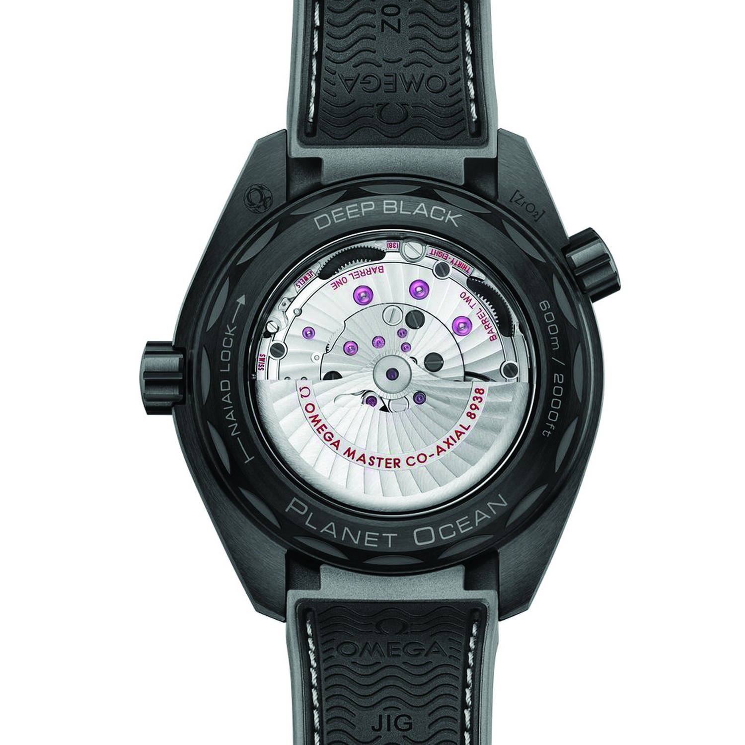 Diese Worldtimer wird an einem integrierten Armband aus schwarzem strukturiertem Kautschuk mit schwarzgrauer Unterseite und grauen Nähten getragen, das über eine Faltschließe aus Keramik und keramisiertem Titan verfügt. Angetrieben wird die Uhr vom OMEGA Co-Axial Master Chronometer Kaliber 8938, das durch den Saphirglasboden sichtbar ist.