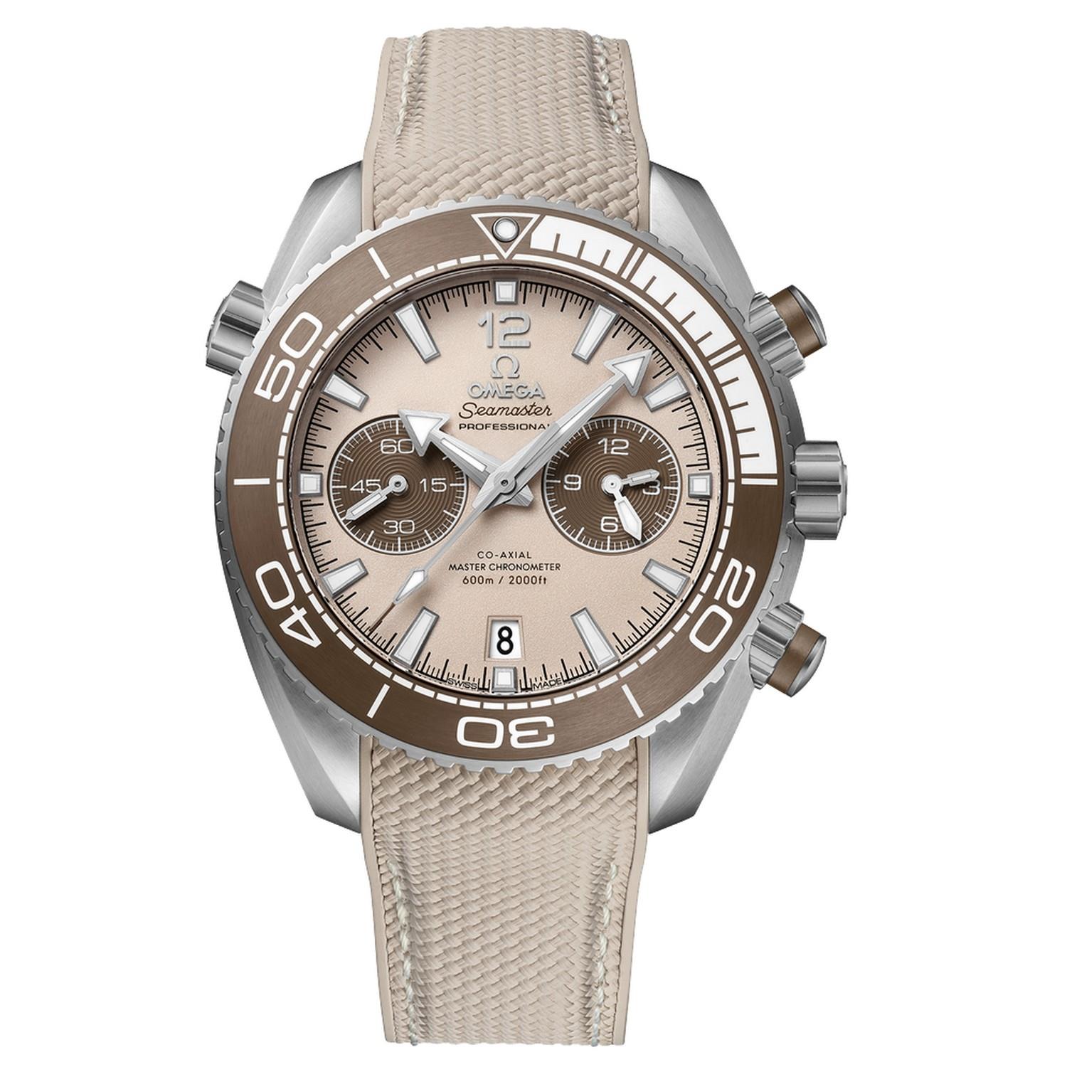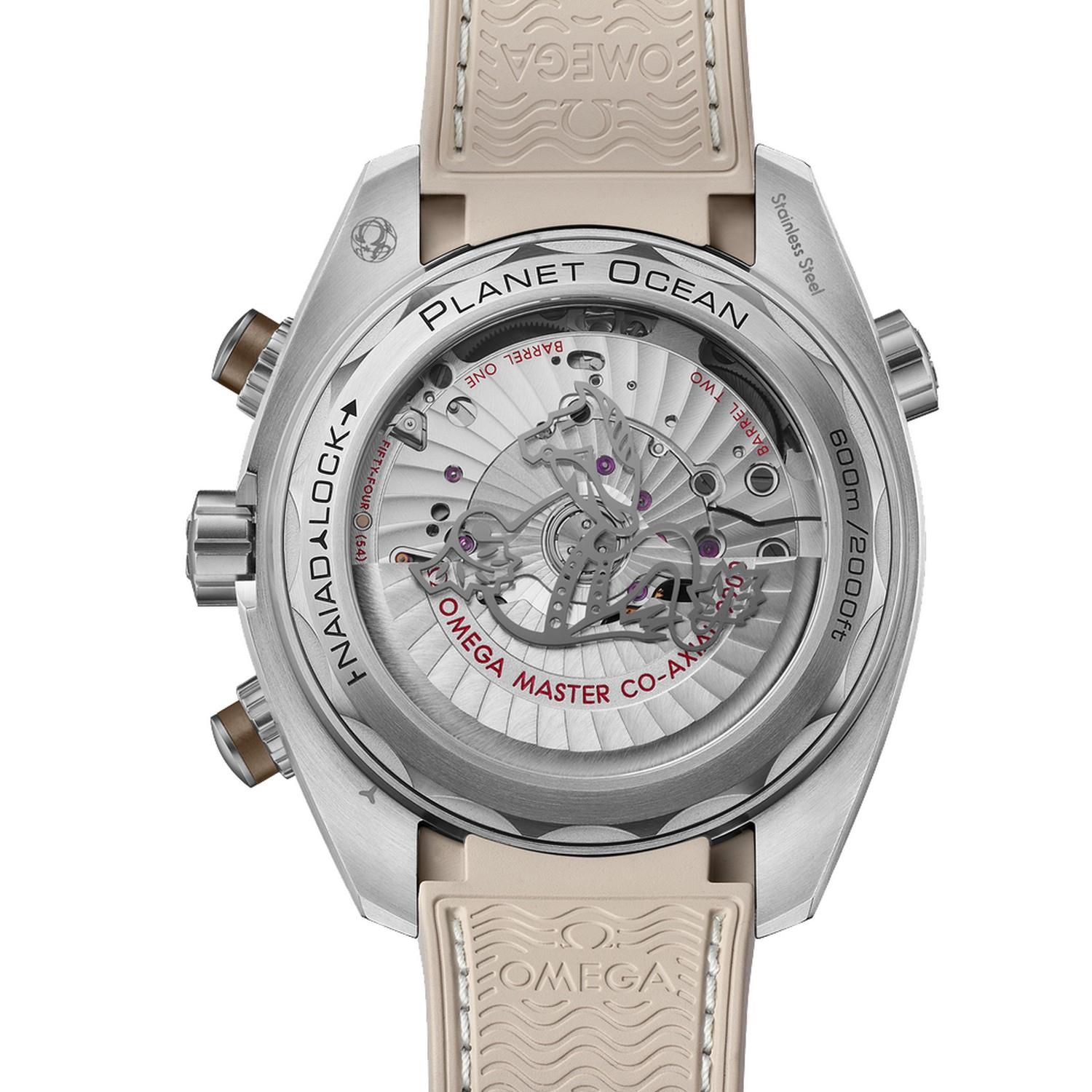 Diese Seamaster Planet Ocean, die vom Co-Axial Master Chronometer Kaliber 9900 angetrieben wird, ist mit einem integrierten beigefarbenen Kautschukarmband mit strukturiertem Muster und weißer Naht ausgestattet. Den NAIAD LOCK Gehäuseboden ziert ein metallisiertes Seepferdchen auf dem Saphirglas.