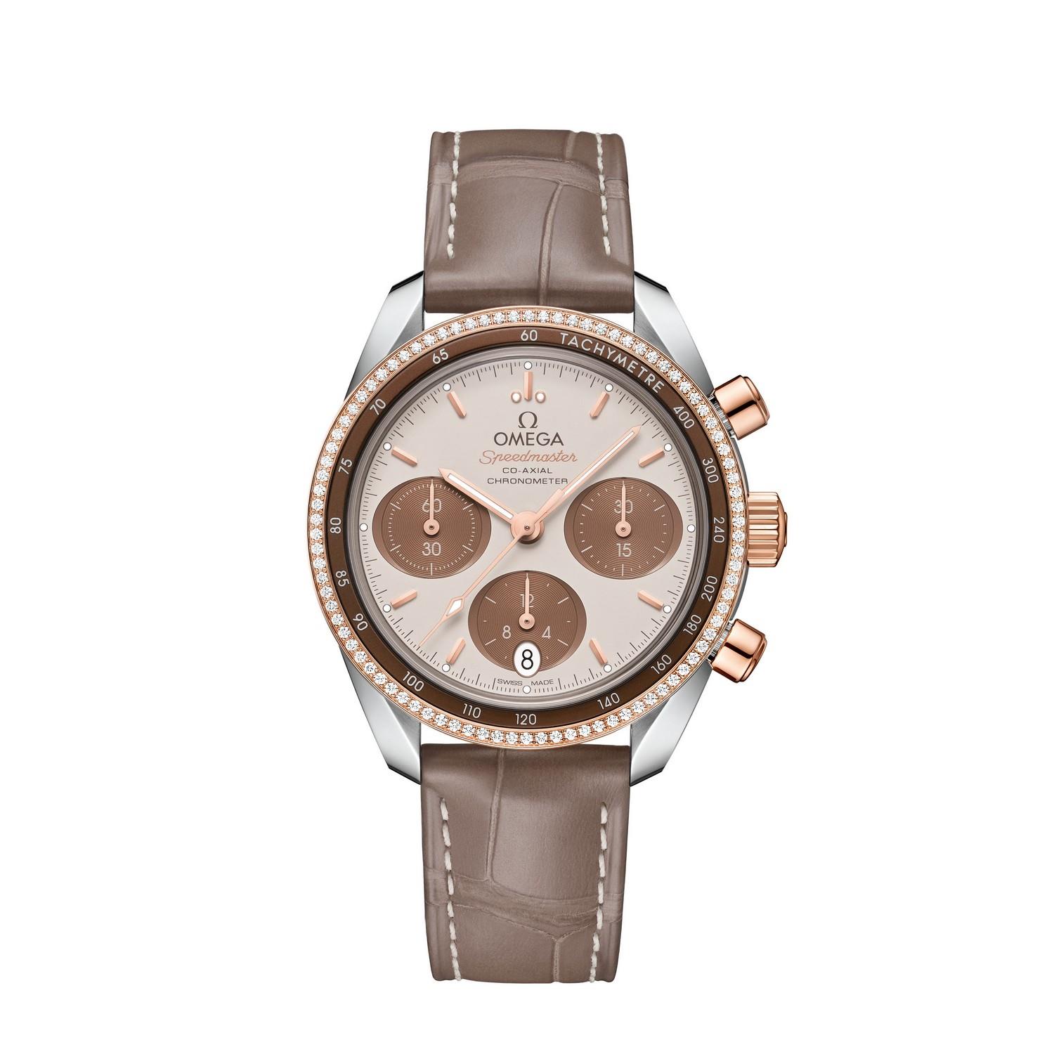 Die Uhr wartet mit einem taupe-braunen Lederarmband sowie einem Seepferdchen-Medaillon auf dem Gehäuseboden auf und wird von OMEGAs Co-Axial Kaliber 3330 angetrieben.