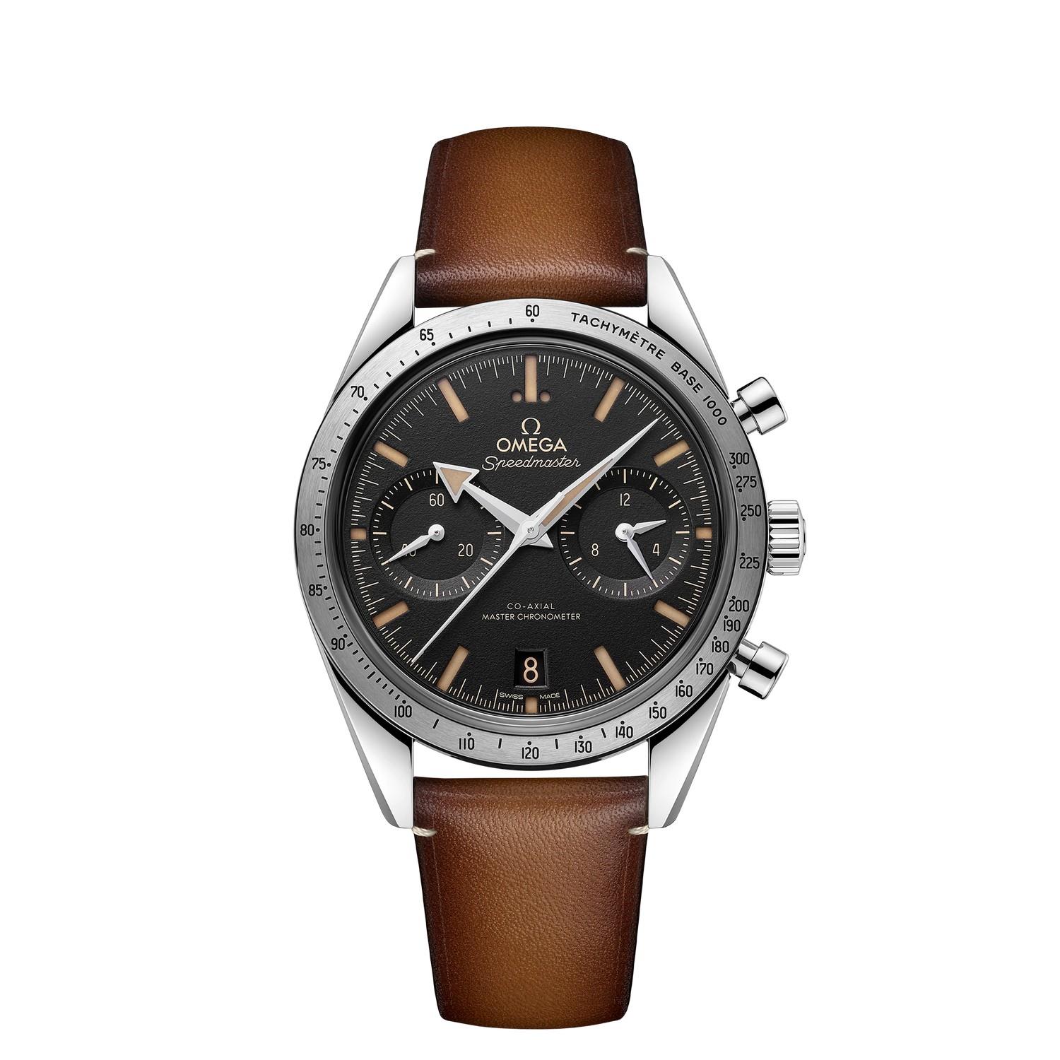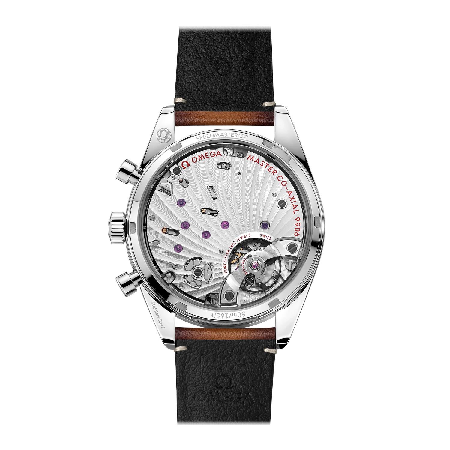 Die gebürstete Lünette ist mit einer geschwärzten Tachymeterskala versehen, während der Gehäuseboden die Gravur „Speedmaster ‘57“ aufweist. Das flache Saphirglas wurde beidseitig entspiegelt.