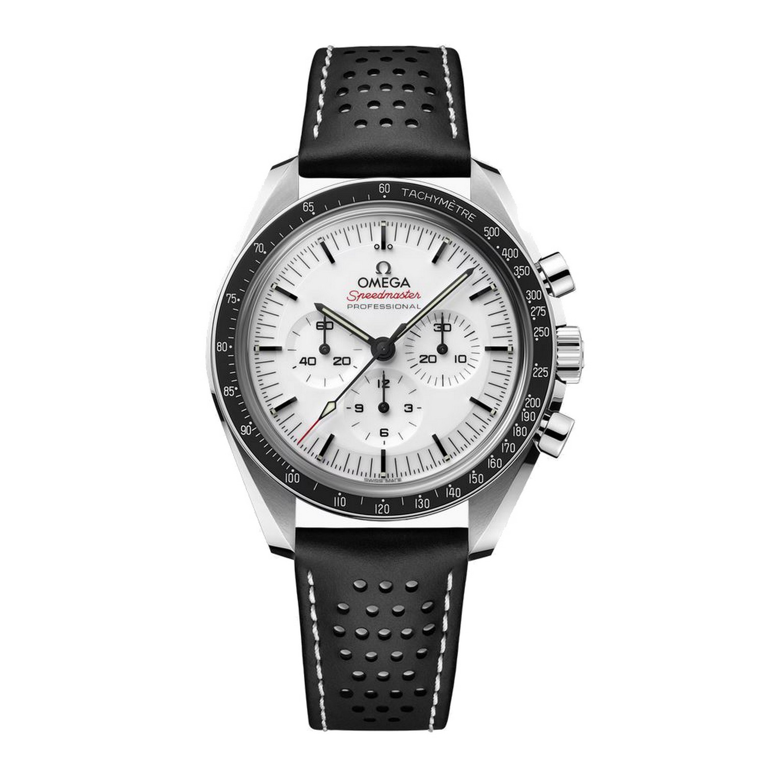 Diese 42-mm-Moonwatch aus Edelstahl wird von einem mikroperforierten, schwarzen Lederarmband mit rot-weißer Naht am Handgelenk gehalten. Als Uhrglas und Gehäuseboden dient Saphirglas. Inspiriert von der 4. Generation der Speedmaster, die auf dem Mond getragen wurde, besitzt das Modell auch ein asymmetrisches Gehäuse, ein weiß lackiertes, abgestuftes Zifferblatt mit appliziertem OMEGA Logo und applizierten Indizes, Zeiger im Moonwatch-Stil und den berühmten Punkt über der 90 auf dem Lünettenring aus schwarzem, eloxiertem Aluminium.