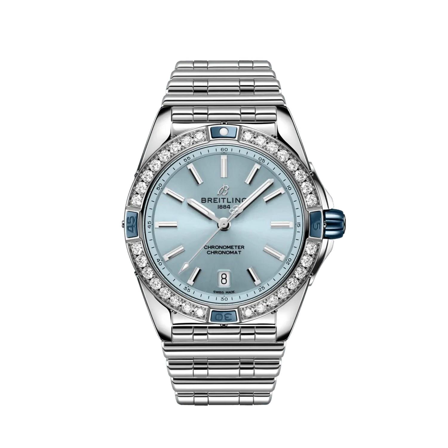 Die Super Chronomat Automatic 38 will ein Hingucker sein, egal, ob man sie zum eleganten Anzug oder zu T-Shirt und Jeans trägt. Die «Super» hebt sich gleich auf den ersten Blick von der übrigen Chronomat Familie ab: Sie hat Reiter und eine Krone aus Keramik, und das Rouleaux-Armband aus Kautschuk gibt es nur für diese maximal ausgestattete Modellreihe. Abgesehen von ihrer markanten Präsenz hat die Automatic 38 auch eine funkelnde Seite. Übergrosse Labor-Diamanten reihen sich um die Lünette aus 18-karätigem Rotgold oder aus Edelstahl. Ihre Zifferblattfarben bieten genau das richtige Mass an Augenweide. Kombinieren Sie Ihre Lieblingsfarbe mit einem Armband.