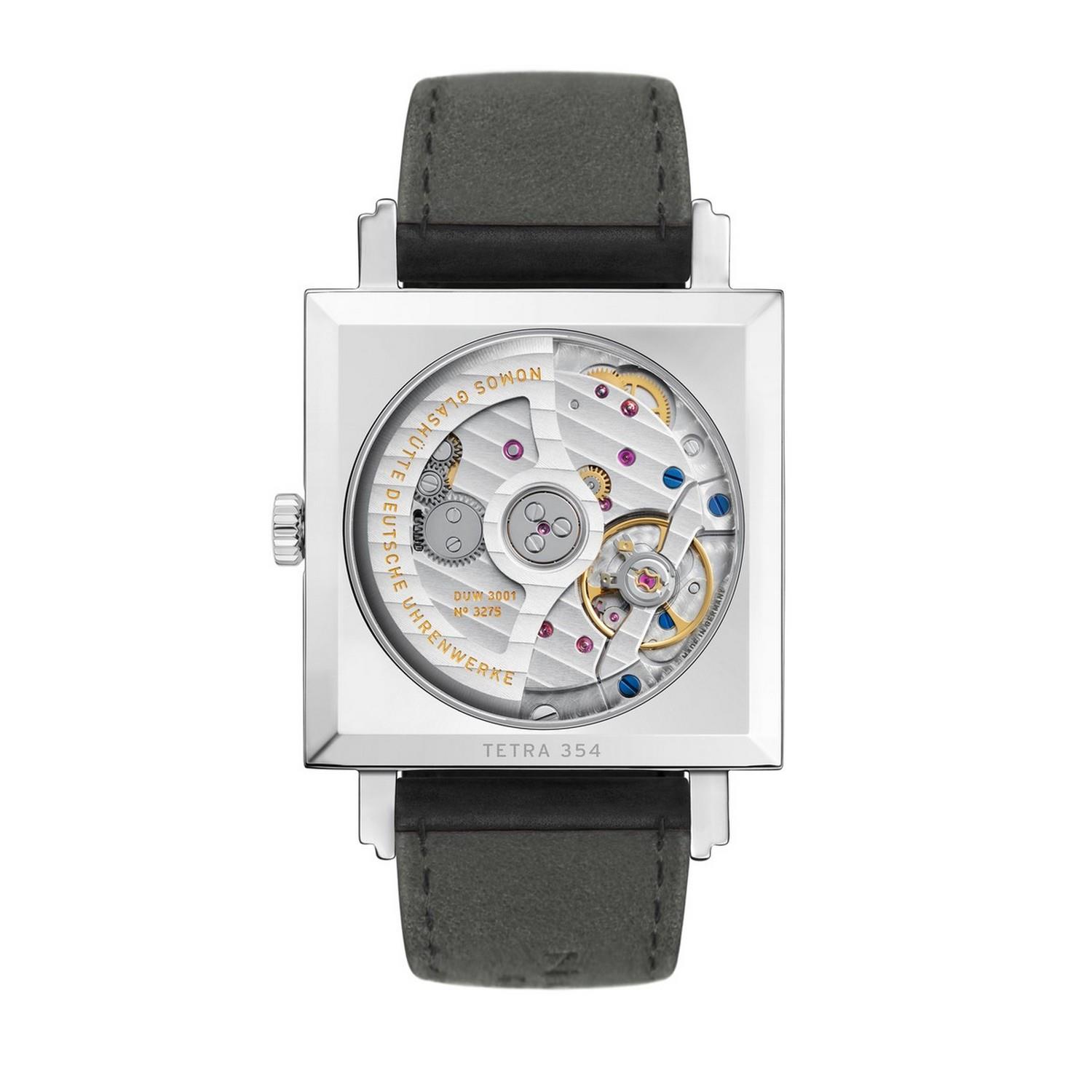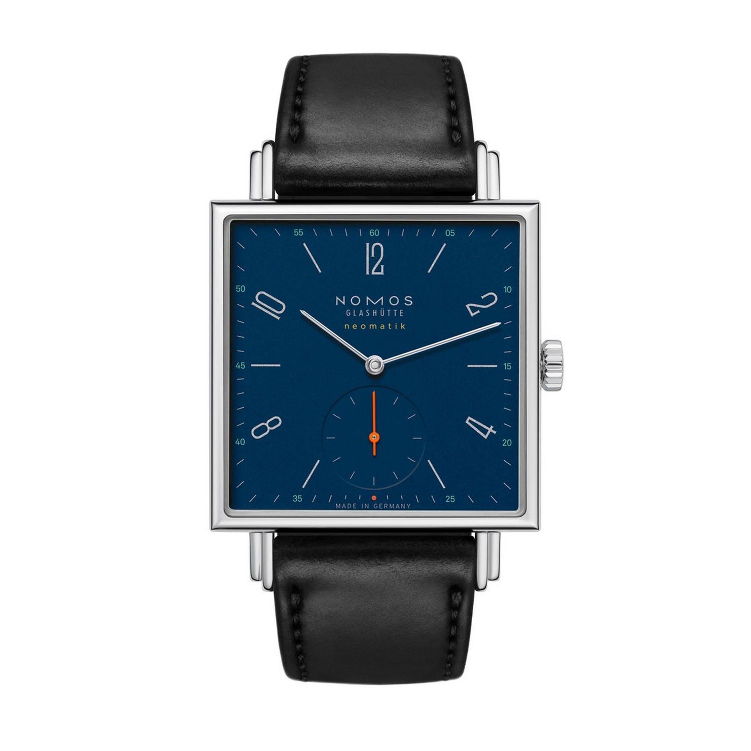 Der eckige NOMOS-Klassiker Tetra in automatisch. Das nachtblaue Zifferblatt bildet die perfekte Kulisse für die grüne Minuterie und den neonorangenen Sekundenzeiger. Das Automatikkaliber ist nur 3,2 Millimeter hoch, deshalb bleibt die Uhr flach – und mit einer Diagonale von 46 Millimetern bereit für jedes noch so männliche Handgelenk.