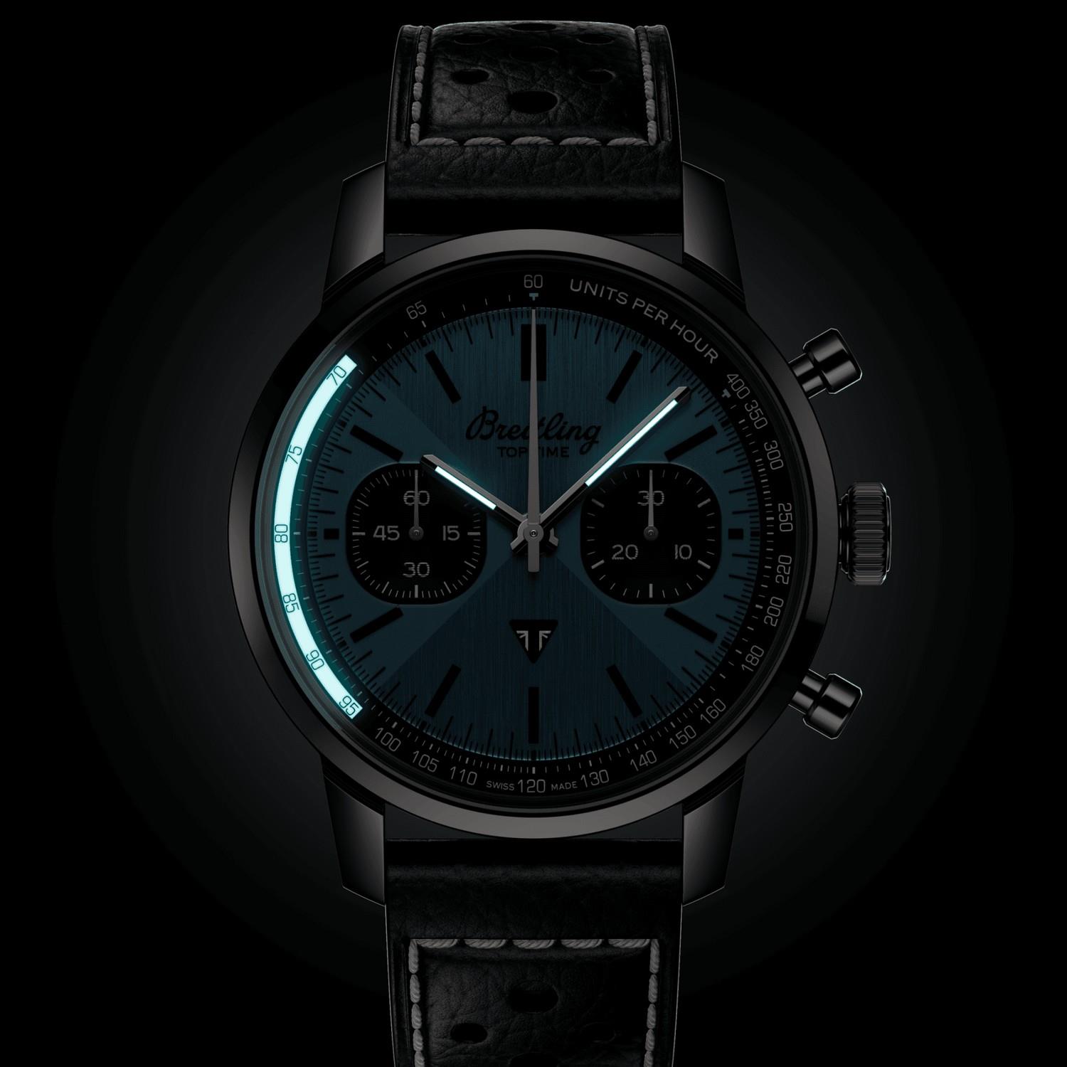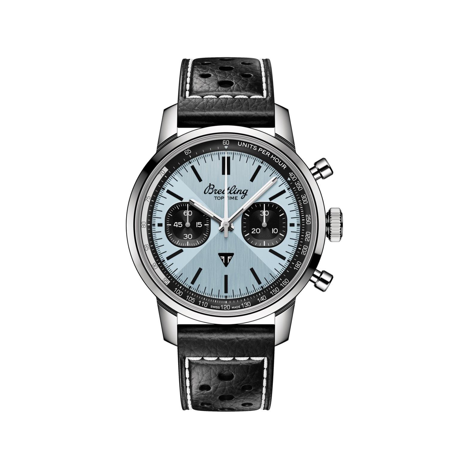 Breitlings unkonventioneller Chronograph mit dem ungezähmtem Café-Racer-Spirit der Sixties. In den frühen 1960er-Jahren erlebte der Rennsport seine Blütezeit. Es entstand eine ganze Subkultur um sogenannte «Café Racer» – elegante Motorräder, die ihre Fahrer wortwörtlich von einem angesagten Café zum anderen beförderten. Willy Breitling wollte den tempoverliebten Stil jener Tage mit einer ganz neuen Interpretation des Zeitmessers einfangen. Vorhang auf für die Breitling Top Time, einen unkonventionellen Chronographen, der ein sofortiger Erfolg wurde und von dessen kühnen Proportionen sich sportlich-schicke Männer und Frauen gleichermassen angezogen fühlten. Heute ist dieser ungezähmte Spirit der Sixties zurück mit einer spektakulären neuen Top-Time-Kollaboration zwischen Breitling und der britischen Motorradmarke Triumph. Der Star dieser Uhr ist das eisblaue Zifferblatt mit seiner eindrucksvollen Interpretation des bekannten Top-Time-Designs «Zorro». Normalerweise in einer Kontrastfarbe gehalten, die die beiden Unterzähler wie die Maske des listigen Schwertkämpfers einrahmt, erhält es hier ein gebürstetes Finish, das ein strahlendes Spiel aus Licht und Textur kreiert. Die einzigartige eisblaue Farbe hat zwei grosse Vorgänger zum Vorbild: eine blaue Triumph Thunderbird 6T von 1951 und eine rare eisblaue Breitling Top Time Ref. 815 aus den 1970er-Jahren. Zu den Features gehören übergrosse pilzförmige Drücker, die eine einfache Kontrolle über die Chronographenfunktionen Start, Stopp und Nullstellung ermöglichen. Die kontrastreiche Tachymeterskala sorgt für eine klare Leserlichkeit der Geschwindigkeitsanzeige. Das dezente Kalbslederarmband im Rennsportstil lässt das Zifferblatt glänzen, während die Logos von Breitling und Triumph zurückhaltend auf 12 und 6 Uhr in Erscheinung treten. Mit 41 mm Durchmesser ist die Uhr wie das Original für beide Geschlechter geeignet. Für Triumph-Fans ist die Top Time Triumph ein absolutes Must-have, aber man muss kein atemberaubendes Motorrad besitzen, um ihrem aufsehenerregenden Design zu verfallen.