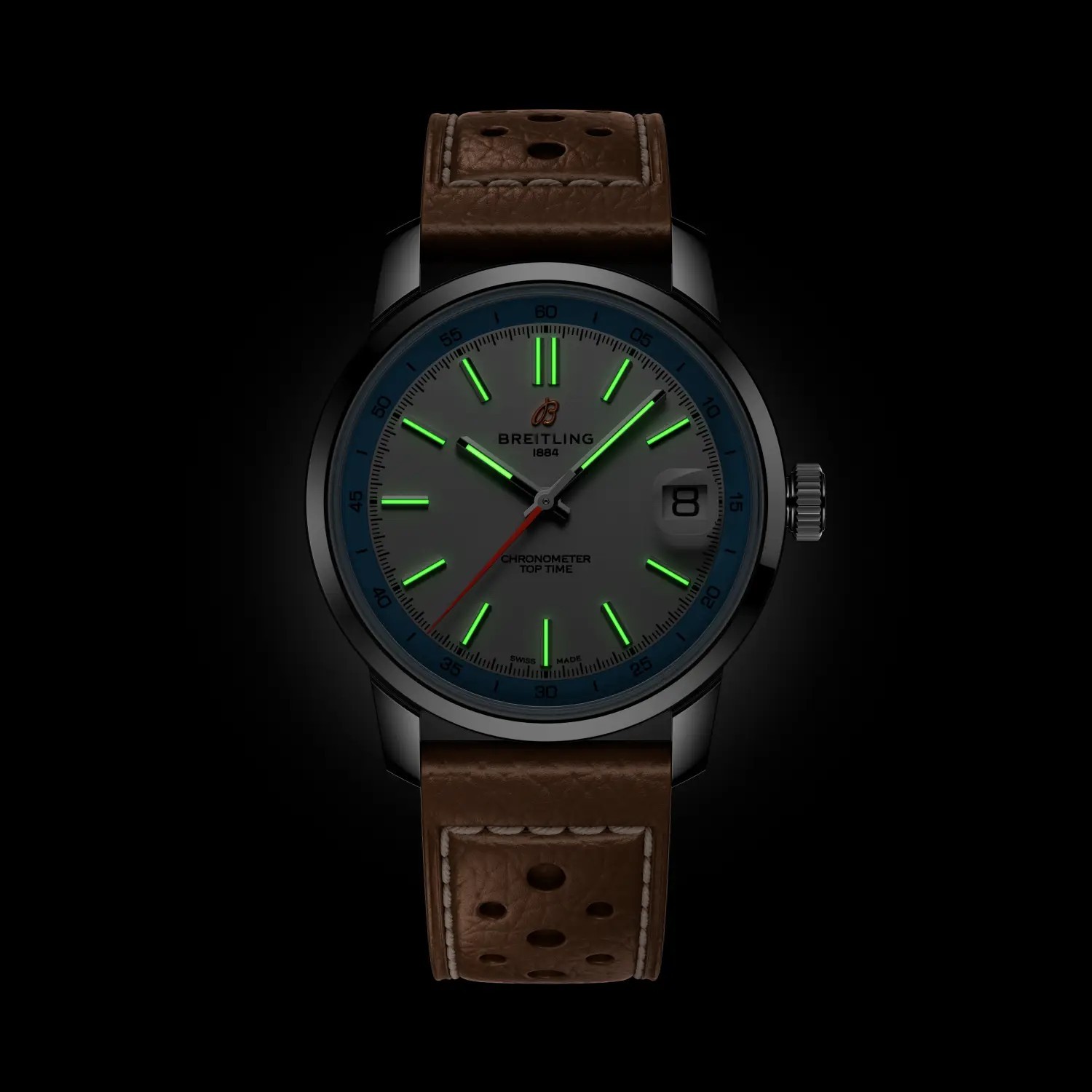 Die im Jahr 2025 neu lancierte Top Time B31 stellt das Debüt des Manufakturwerks B31 im Hause Breitling dar. Das 38-mm-Gehäuse bleibt der DNA der Top Time treu und gewährleistet einen makellosen Stil, der an jedes Handgelenk passt. Die Top Time B31 vereint Retro-Ästhetik mit modernem Anspruch. Das Design des Zifferblatts ist von den Armaturenbrettern der Oldtimer inspiriert, während das 38-mm-Gehäuse ein Gleichgewicht zwischen Vintage-Proportionen und modernem Design schafft und dank seiner universellen Grösse an jedes Handgelenk passt. Drei Farbvarianten – Grün, Blau oder eine zweifarbige Kombination aus Weiss und Himmelblau – werden entweder mit einem dreireihigen Edelstahlarmband oder einem perforierten Kalbslederarmband kombiniert, das an Rennhandschuhe erinnert. Diese Uhr zelebriert Individualität und Abenteuer, egal ob auf offener Strasse oder einfach im Alltag.