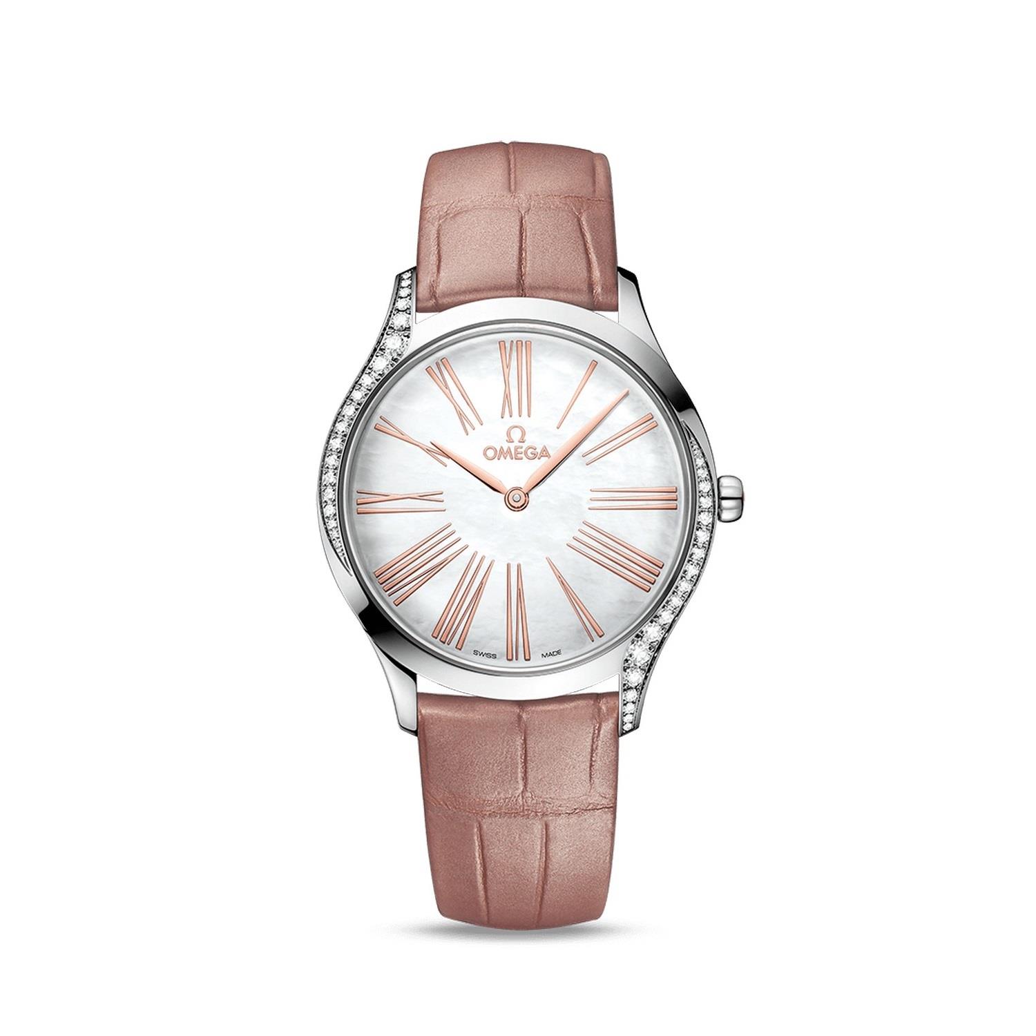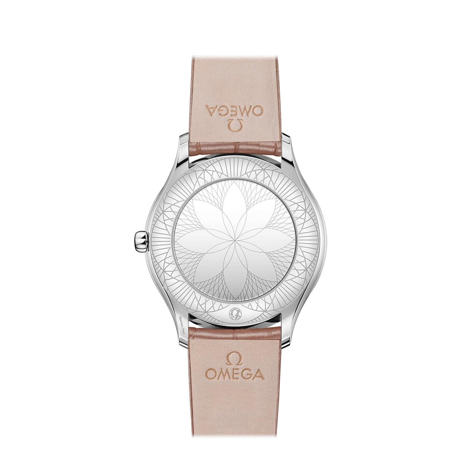 Die Uhr wird von dem OMEGA Kaliber 4061 angetrieben, das direkt hinter dem Gehäuseboden aus Spezialglas mit aufgedampftem „Her Time“-Motiv schlägt. Und schließlich verfügt die Uhr über ein nudefarbenes Lederarmband mit Trésor-Schließe.