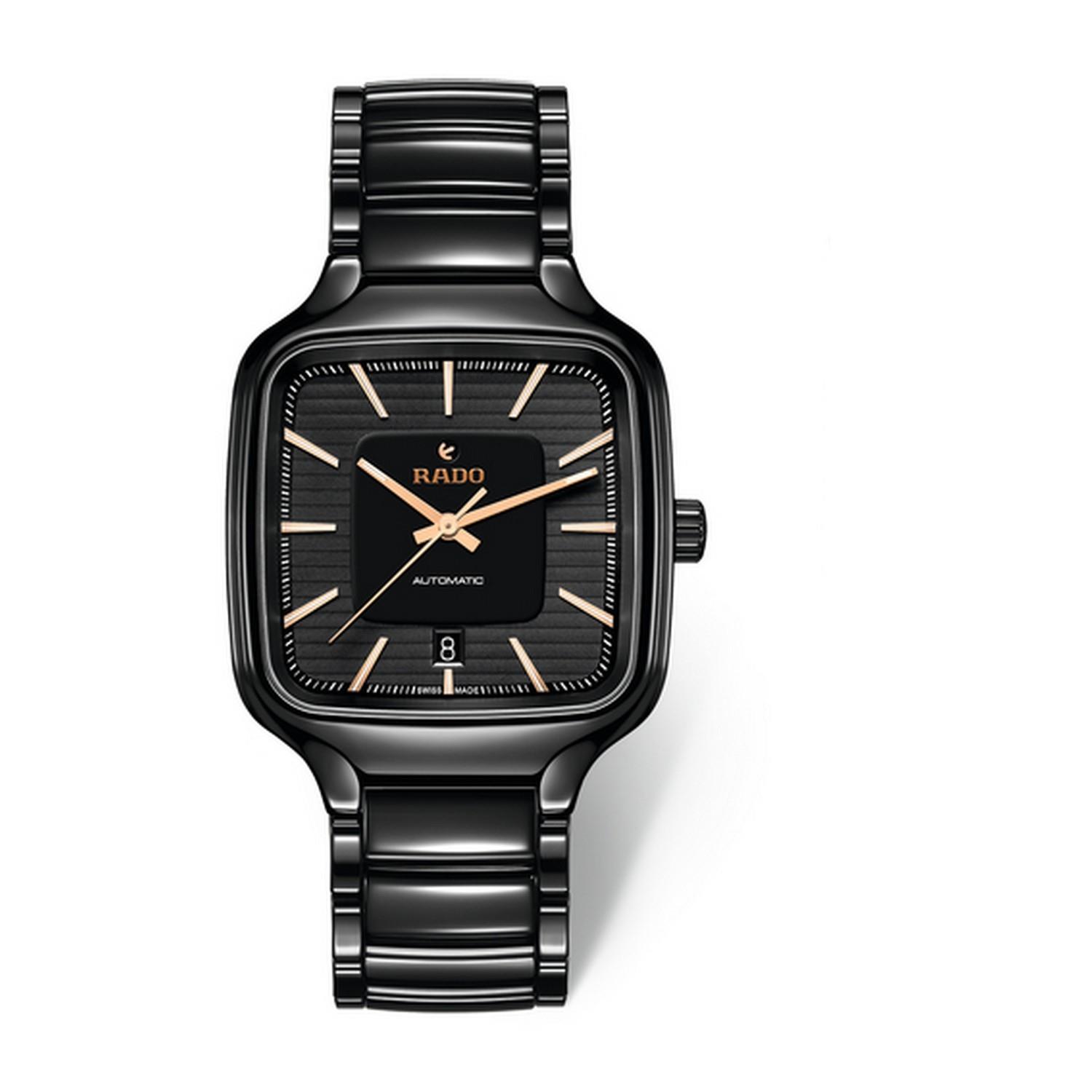 Gehäuse und Krone der 38 mm grossen True Square sind aus polierter schwarzer Hightech-Keramik gefertigt. Die Uhr verfügt über ein flaches Saphirglas. Das Rado Automatikwerk Kaliber R763 sorgt für eine präzise und zuverlässige Zeitmessung. Die roségoldfarbenen Zeiger und Indizes mit weissem Super-LumiNova® sind farblich perfekt auf das Zifferblatt abgestimmt. Dieses verfügt über eine geprägte horizontale Struktur in Schwarz. Die Uhr bietet eine Gangreserve von 80 Stunden und ist bis zu einem Druck von 5 bar wasserdicht. Für den angenehmen Tragekomfort der True Square sorgt ein Armband aus polierter schwarzer Hightech-Keramik mit Dreifach-Faltschliesse aus Titan.