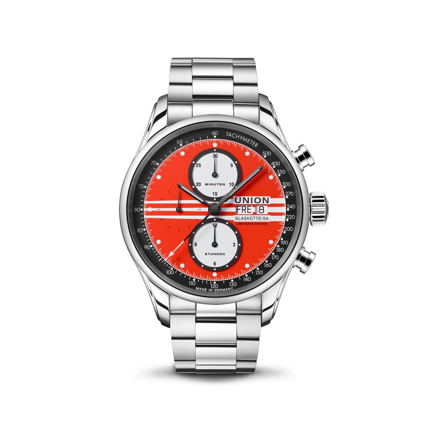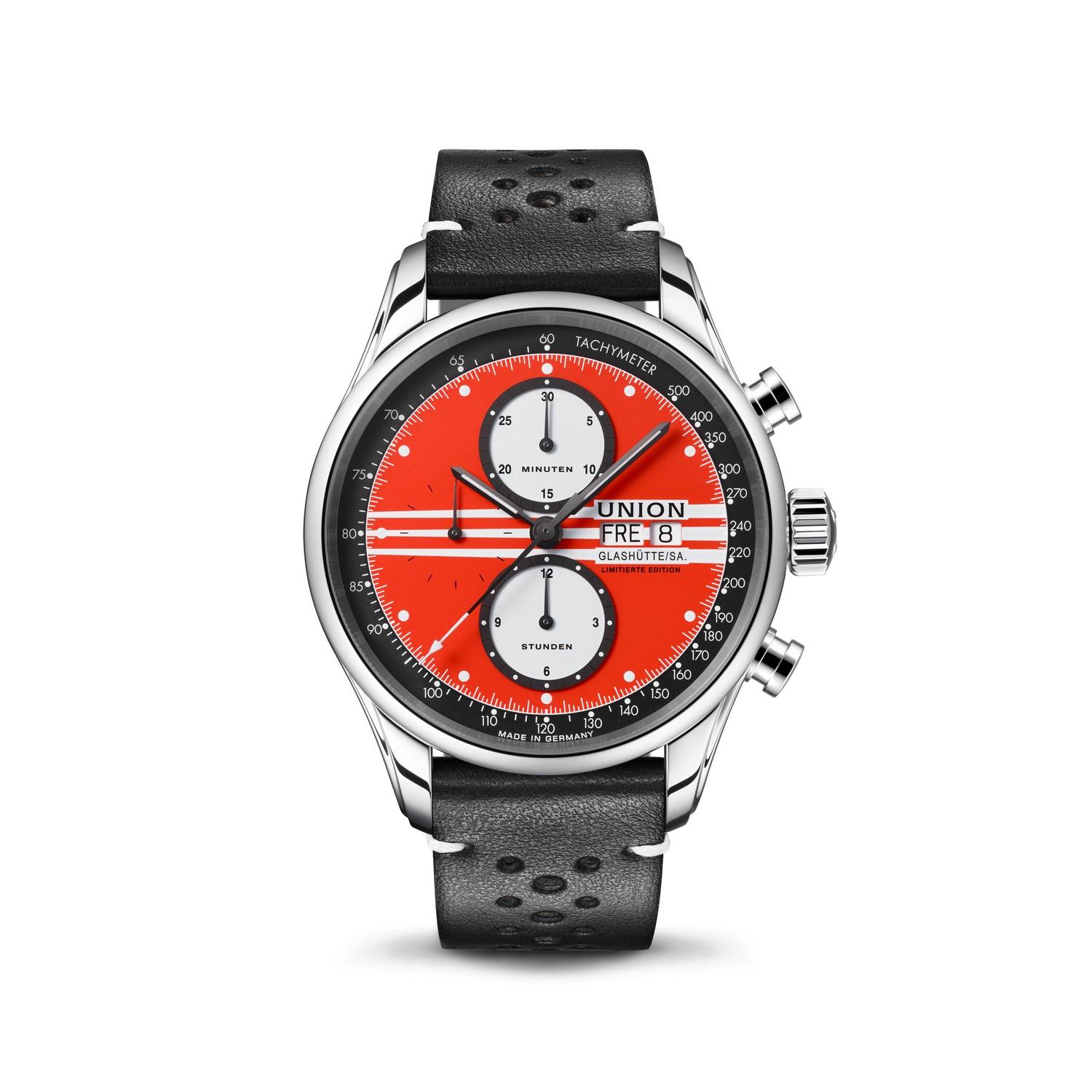 Dieses auf 128 Stück limitierte Sondermodell ist ein echter Hingucker. Sein rundes Edelstahlgehäuse von 44 mm Durchmesser ist mit leichtgängigen Drückern zum Starten, Stoppen und Zurücksetzen der Kurzzeitmessung versehen. Das hochwertige Saphirglas ist beidseitig entspiegelt. Das sportliche blaue Kalbslederband mit Lochung und orangefarbener Rückseite zieht die Blicke aufs Handgelenk. Diese Uhr wird ausgeliefert mit einem Wechselarmband aus Edelstahl.