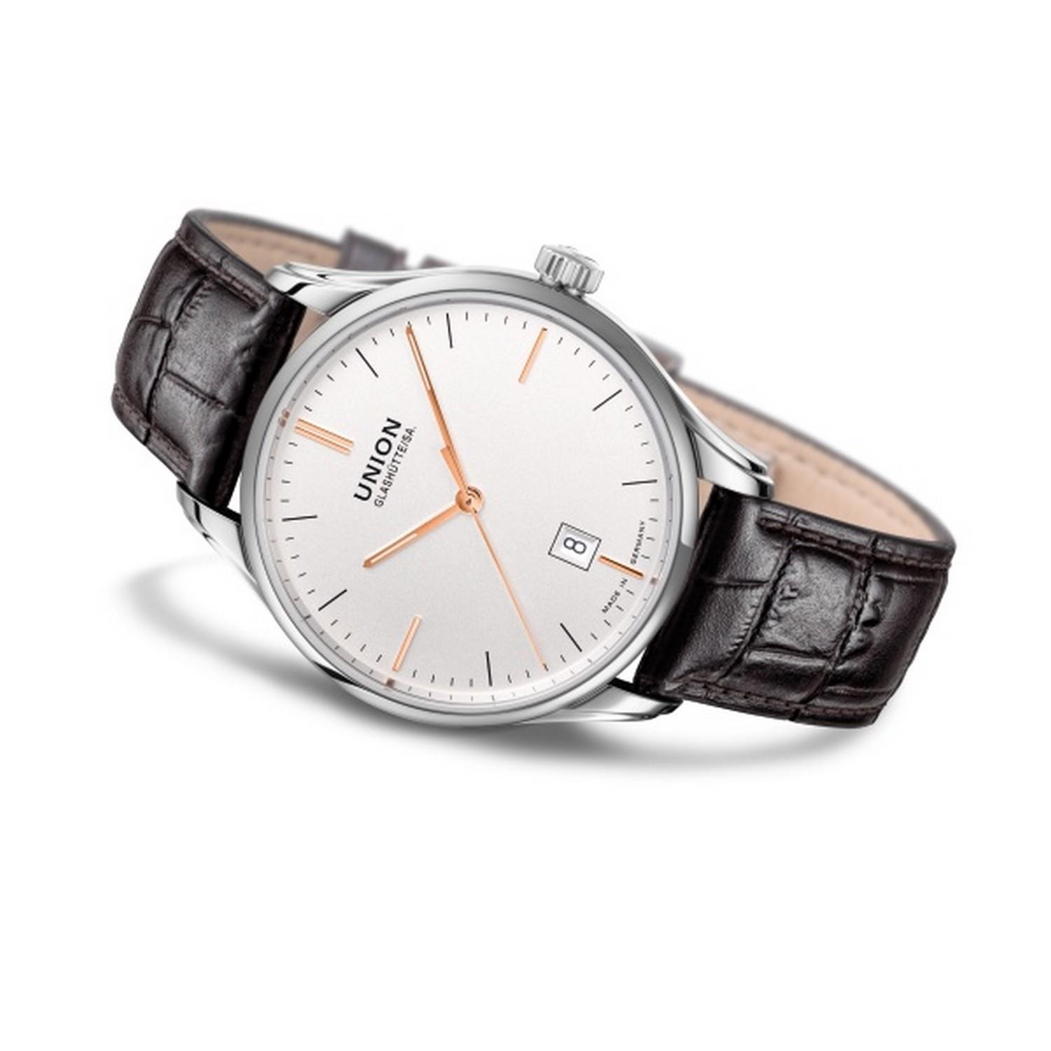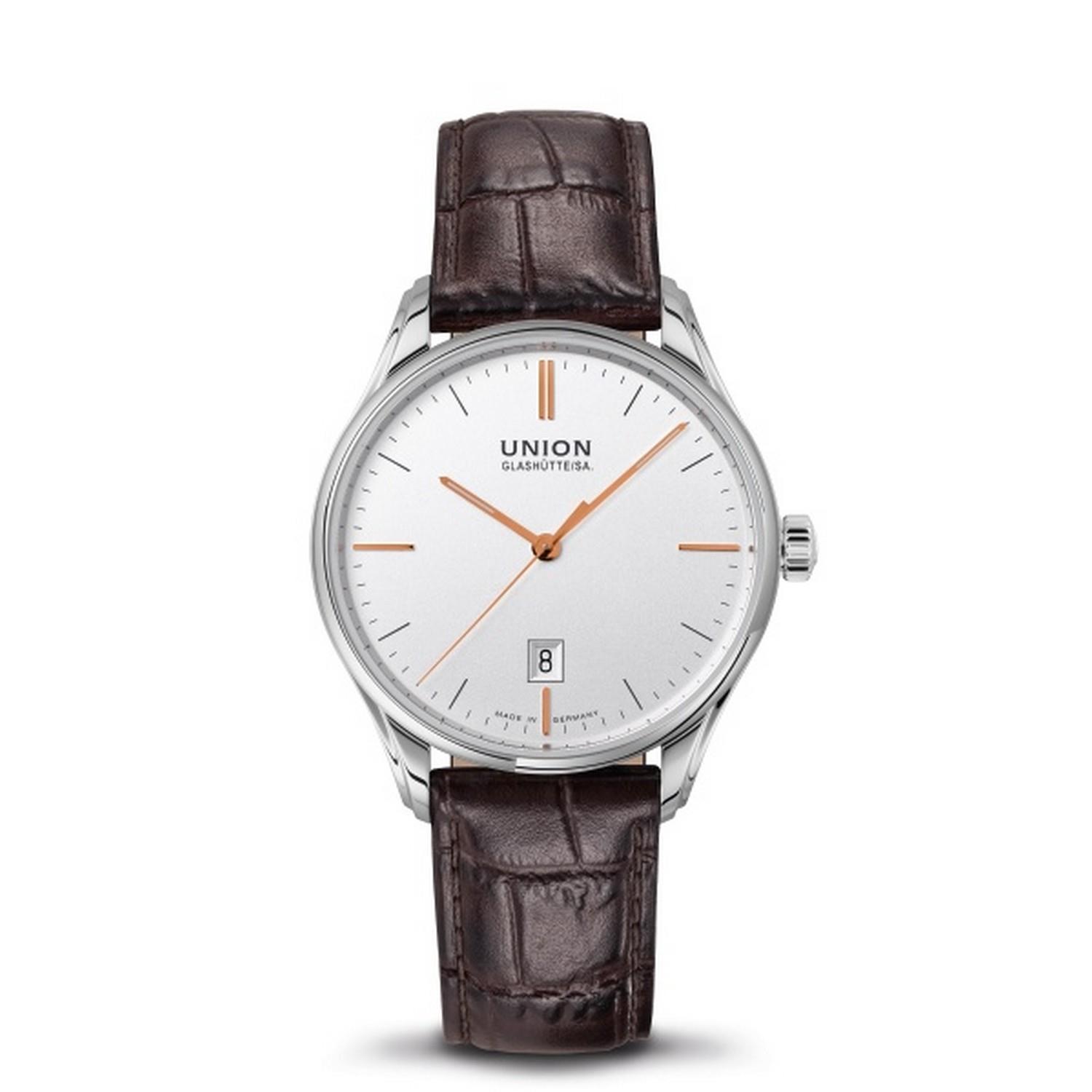 Mit einem Durchmesser von 41 mm und der praktisch randlosen Lünette sorgt das Edelstahlgehäuse der Viro Datum für großzügige Einblicke und einen modernen, eher zurückhaltenden Look. Beidseitig entspiegeltes Saphirglas ermöglicht den bestmöglichen Blick auf das Zifferblatt. Ein braunes Kalbslederband mit Krokoprägung sorgt für einen komfortablen Sitz am Handgelenk und rundet das Profil dieser Uhr ab.