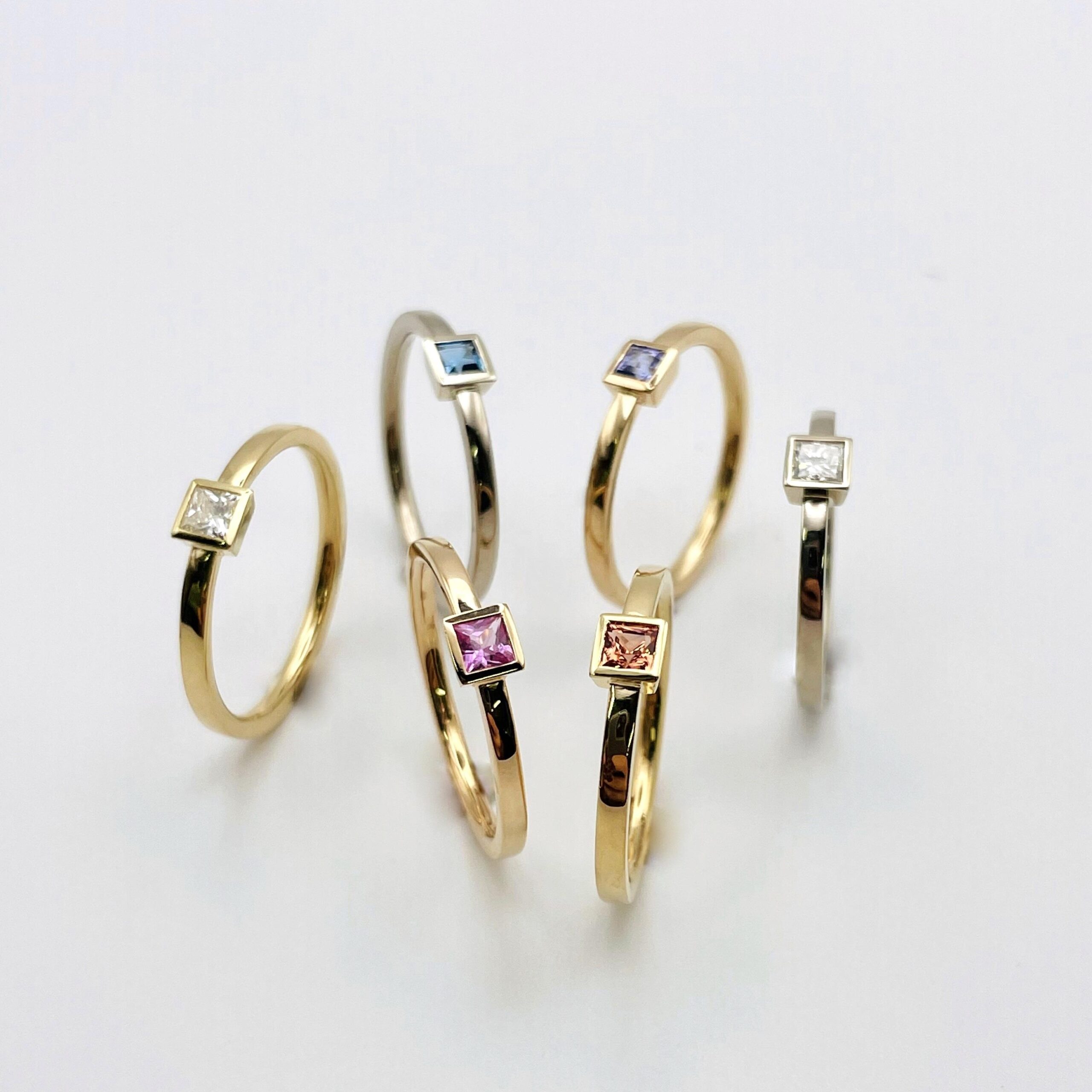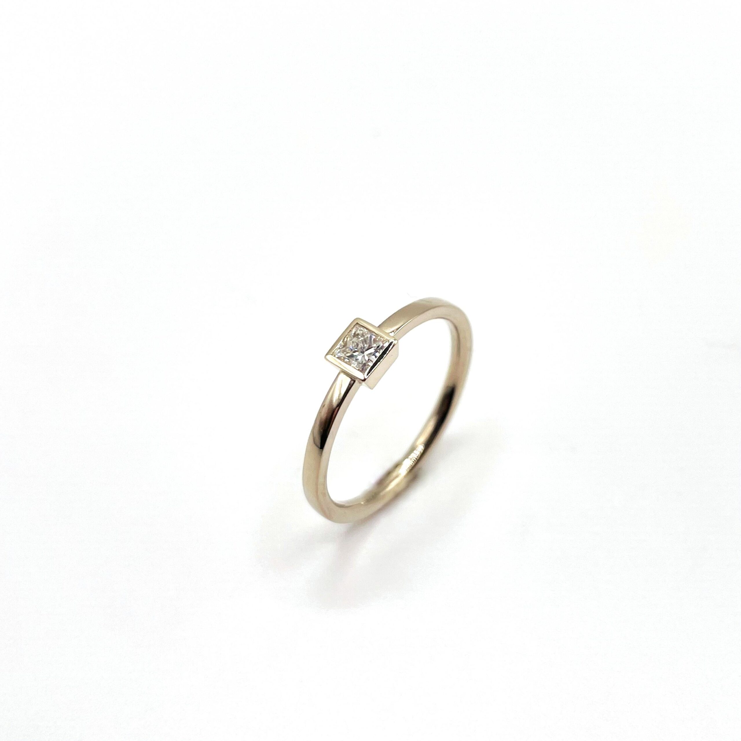 EINE SCHMALE RINGSCHIENE AUS WEIßBGOLD TRIFFT AUF EINEN DIAMANT IM CARRÈSCHLIFF. WIR HABEN HIER EINEN RECYCELTEN DIAMANT IN SEHR GUTER QUALITÄT VERARBEITET.